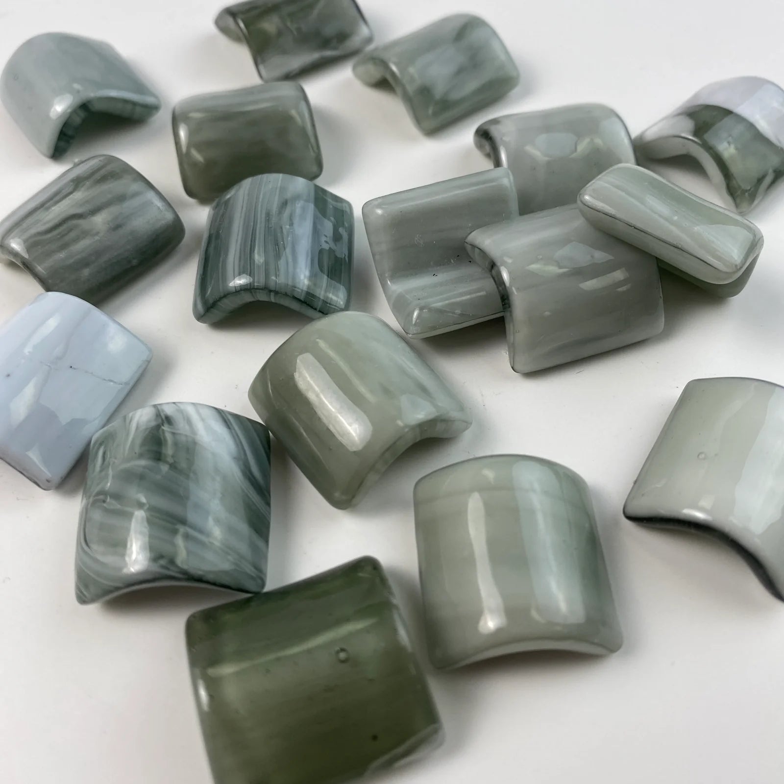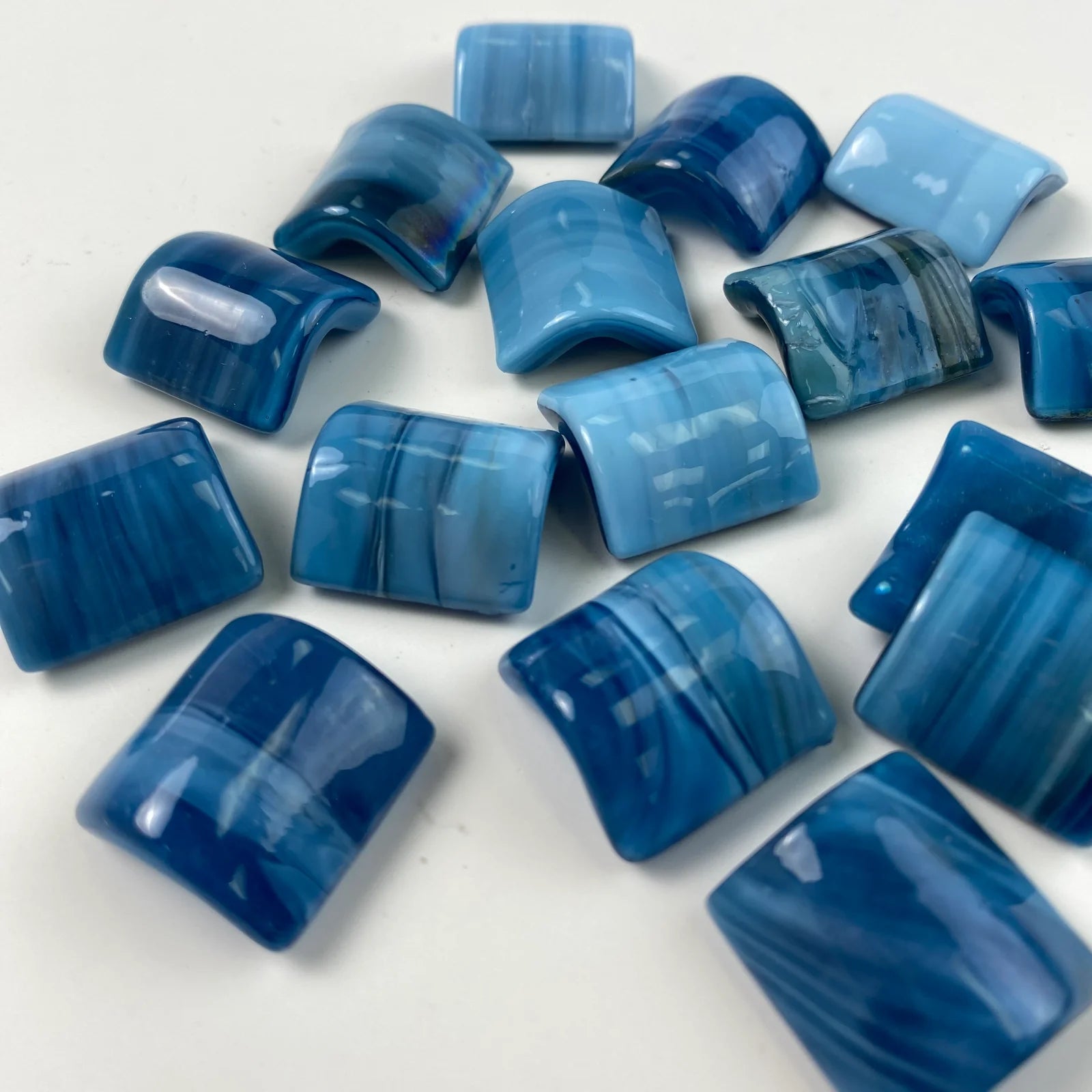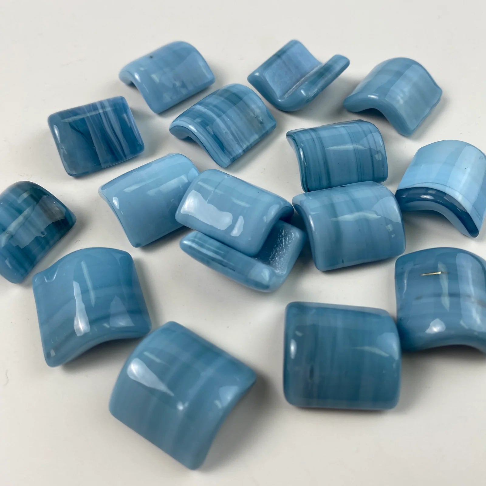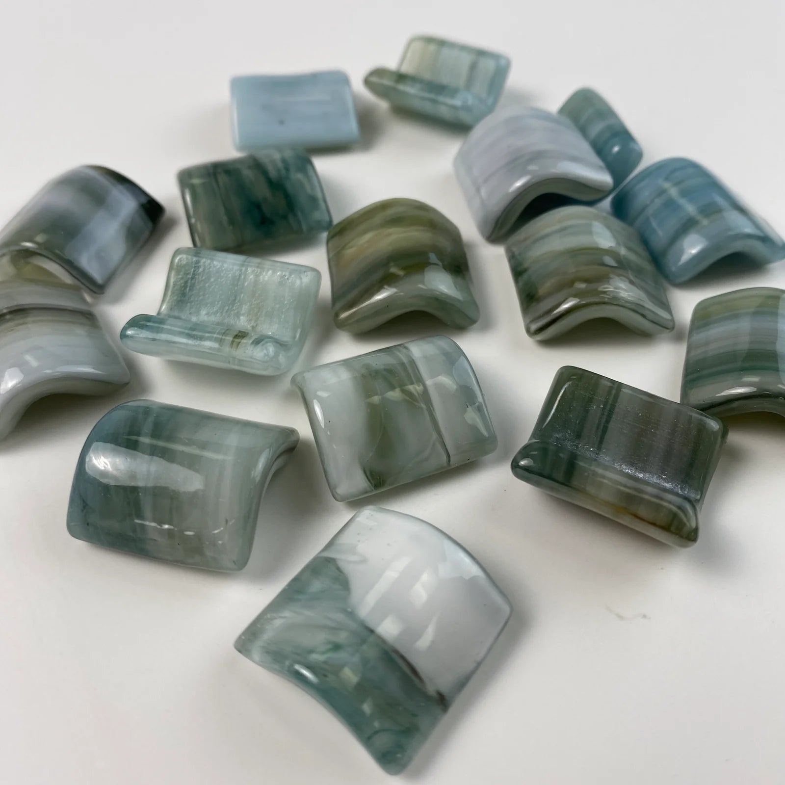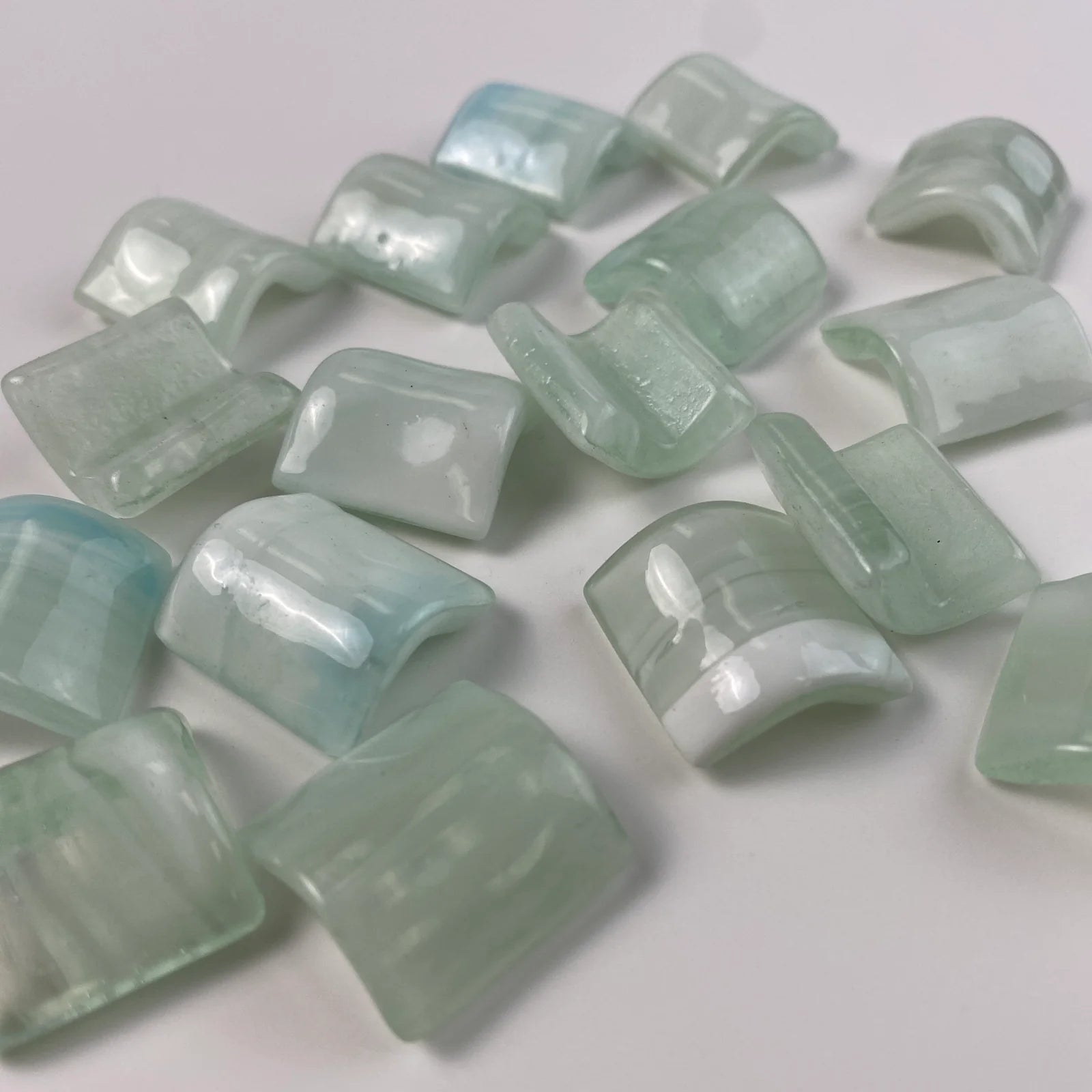 Gently curved 1x1" glass Quarter Round tiles are a beautiful and practical way to soften the edges of steps, corners, and other transitions.